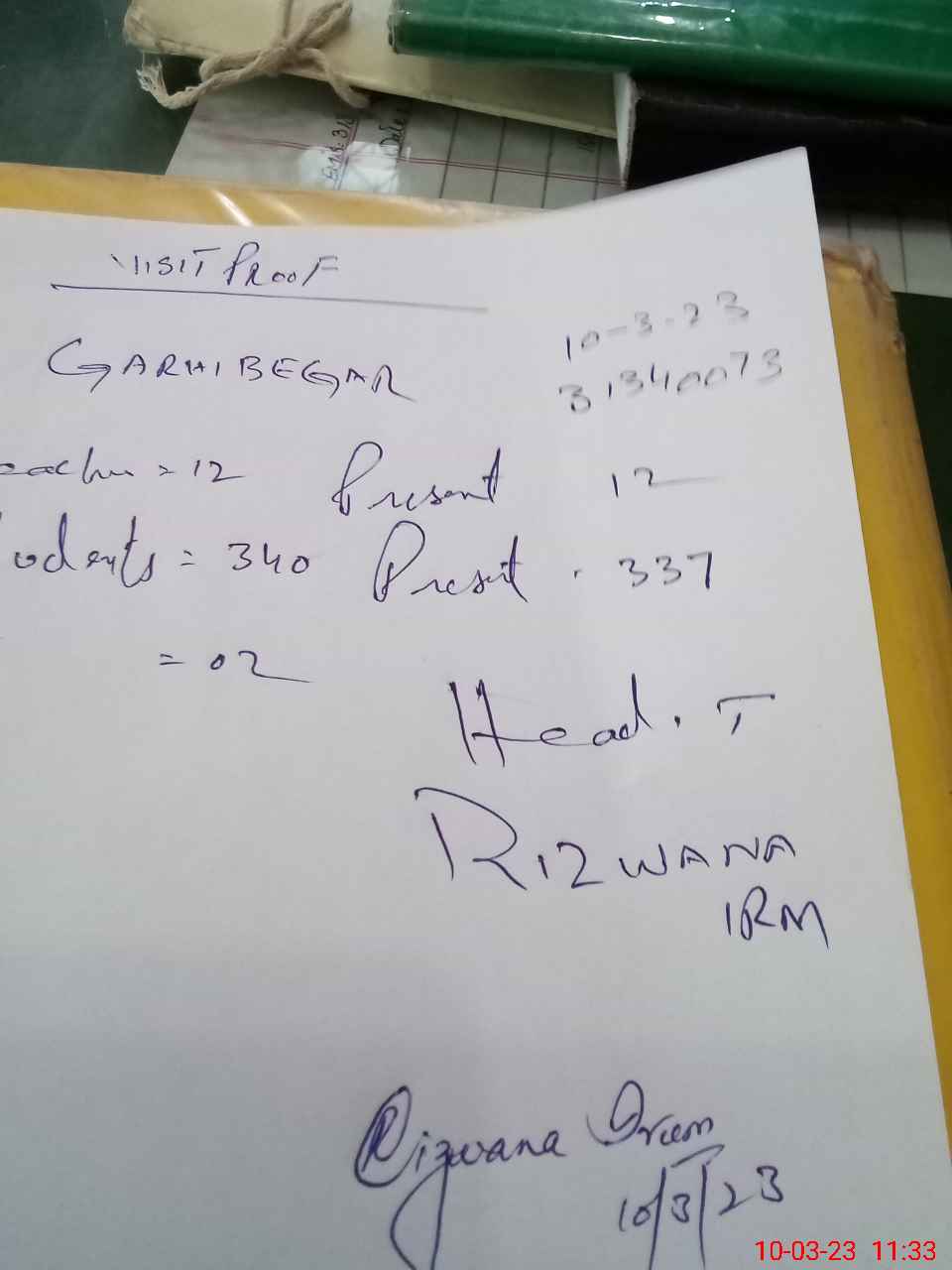 | Attendance Register | Head Teacher | MEA with School | Visit Proof |