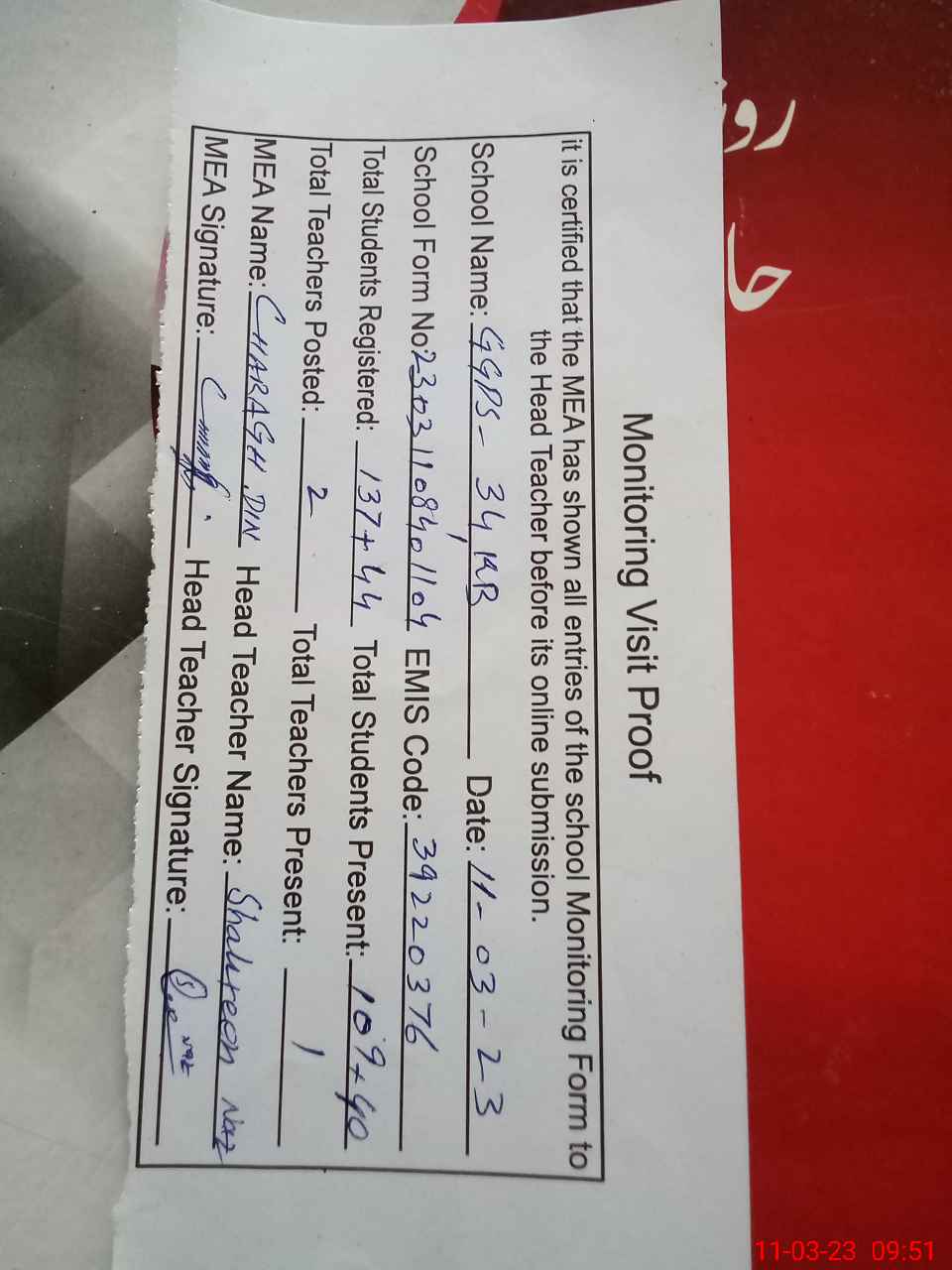 | Attendance Register | Head Teacher | MEA with School | Visit Proof |