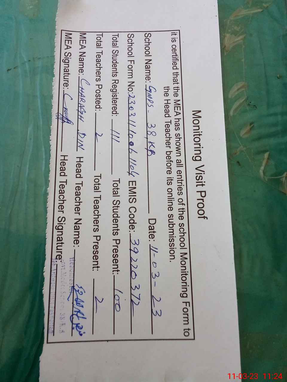 | Attendance Register | Head Teacher | MEA with School | Visit Proof |