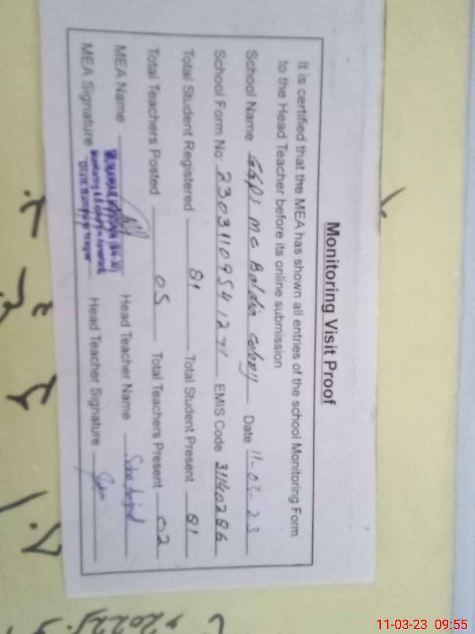 | Attendance Register | Head Teacher | MEA with School | Visit Proof |