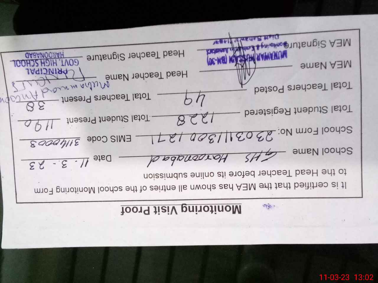 | Attendance Register | Head Teacher | MEA with School | Visit Proof |