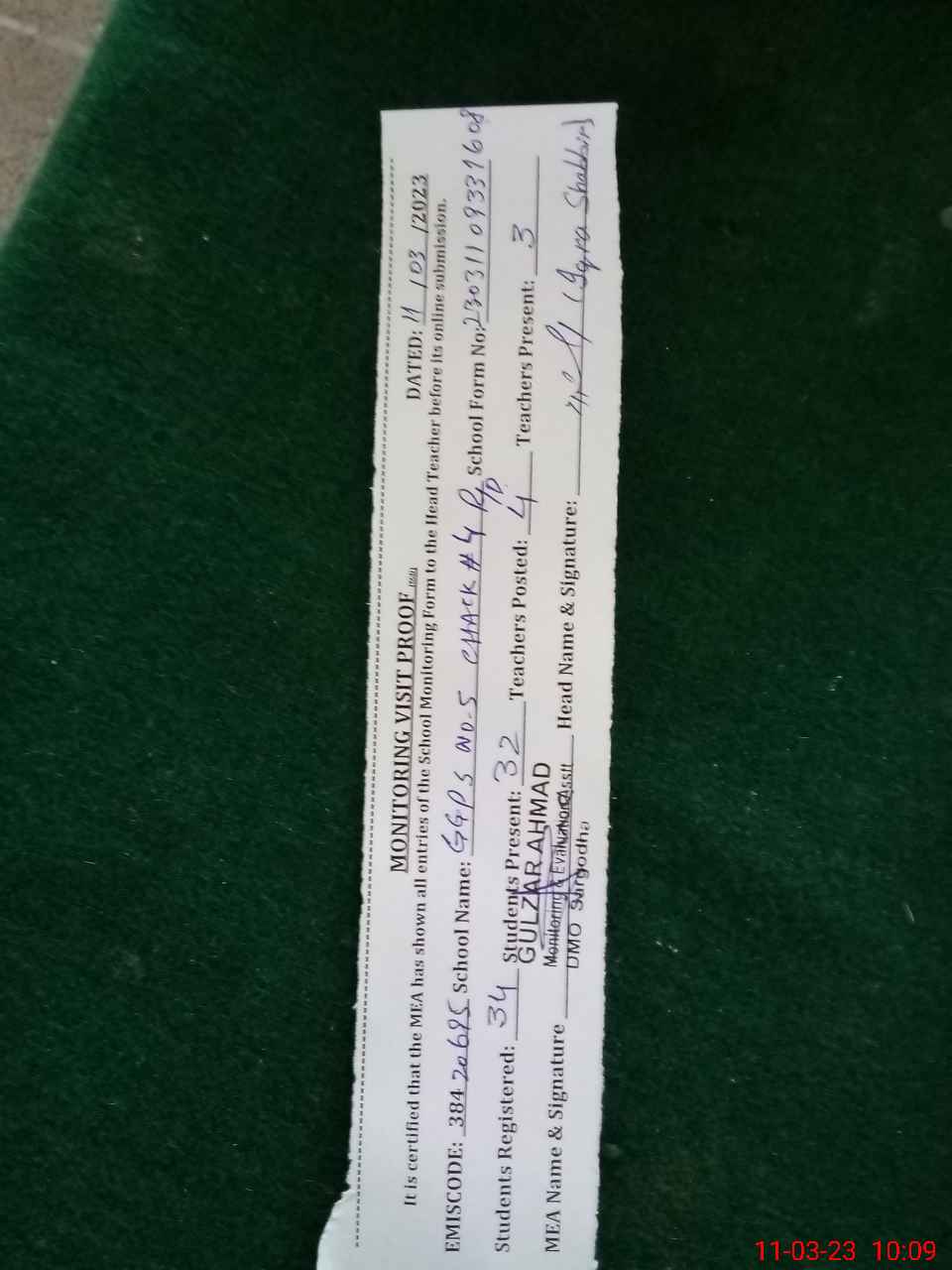 | Monitoring Date: 11-03-2023 | Start Time: 11-03-2023 09:32 AM | End Time: 11-03-2023 10:18 AM | Name of MEA: GU**** AH**** | |