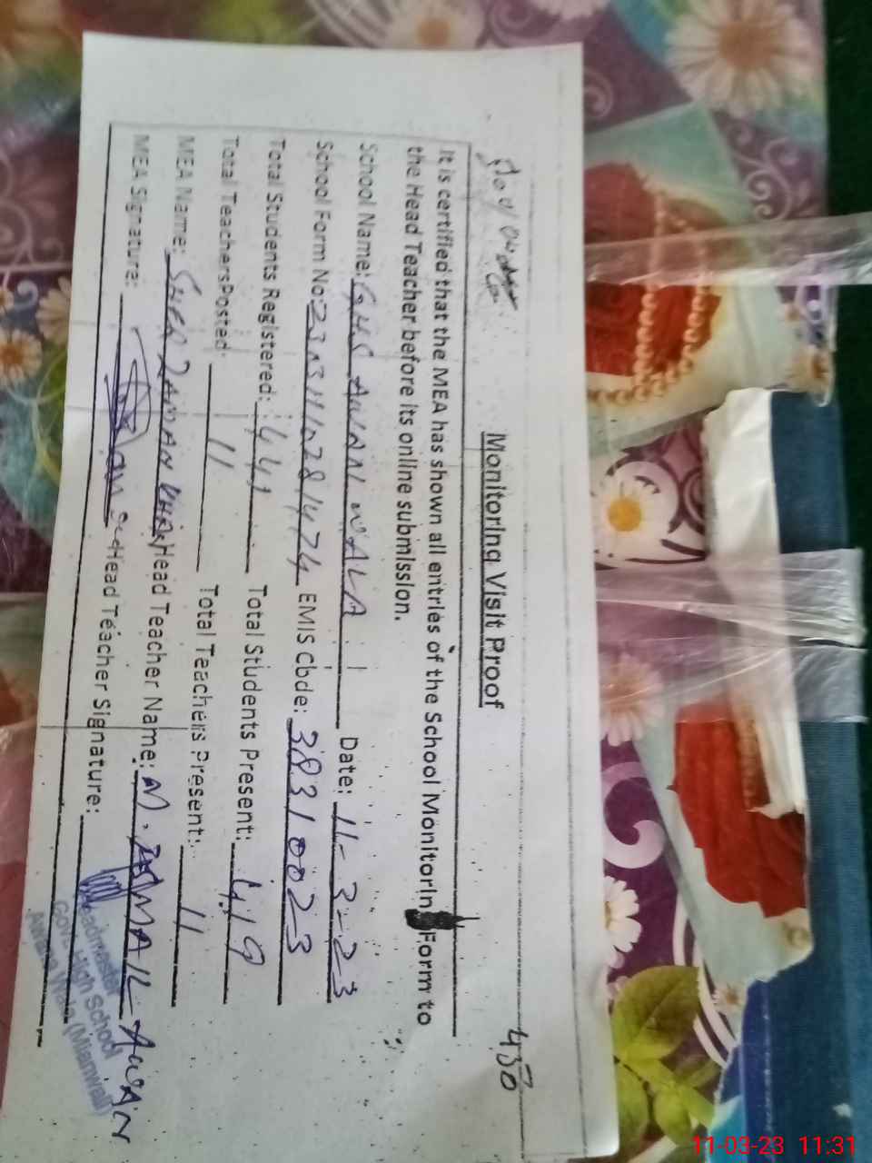 | Attendance Register | Head Teacher | MEA with School | Visit Proof |