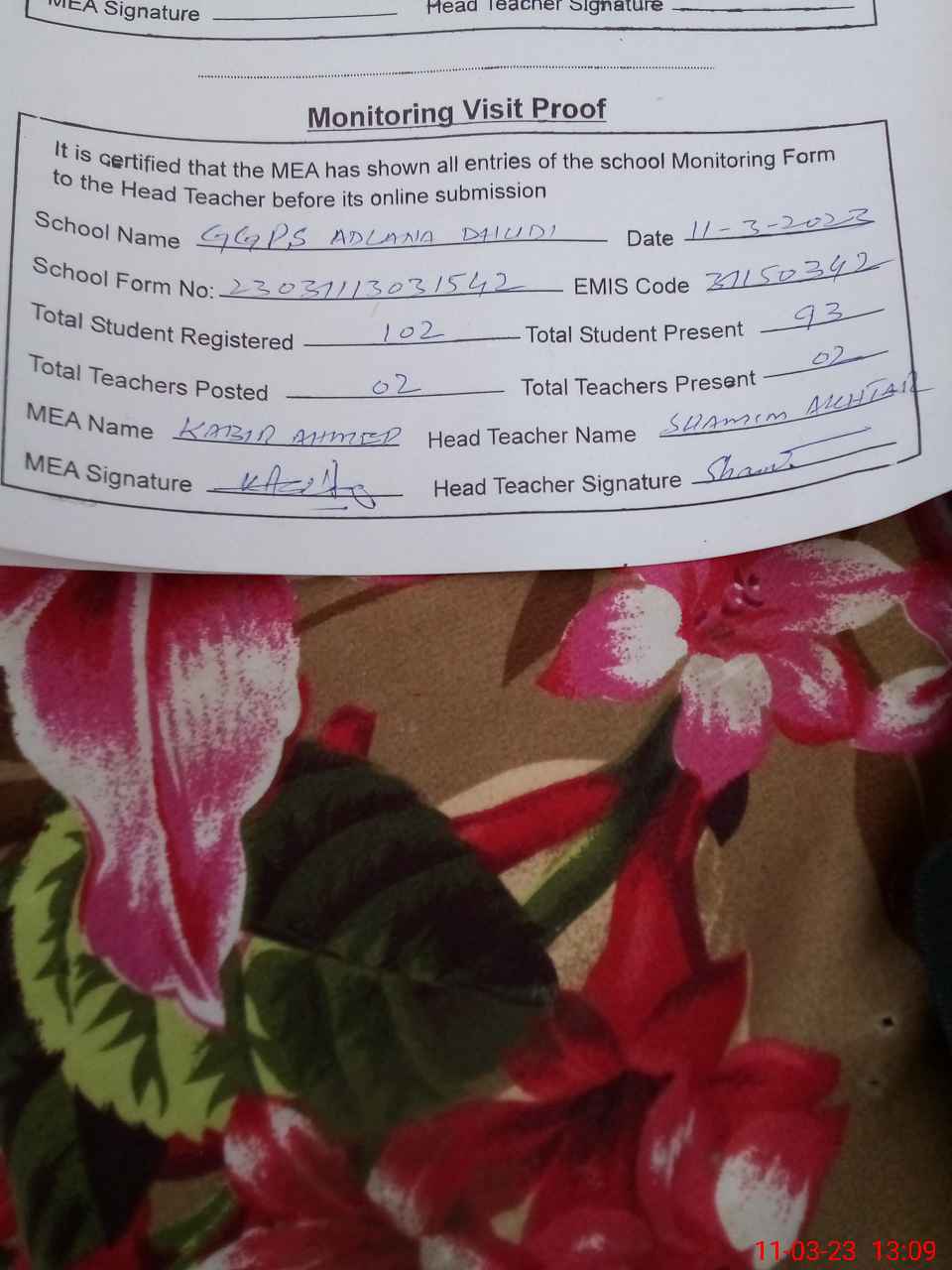 | Certified that this School was Inspected by the Undersigned MEA/DMO Today and the Information Stated Above is as Per Record. | |||||