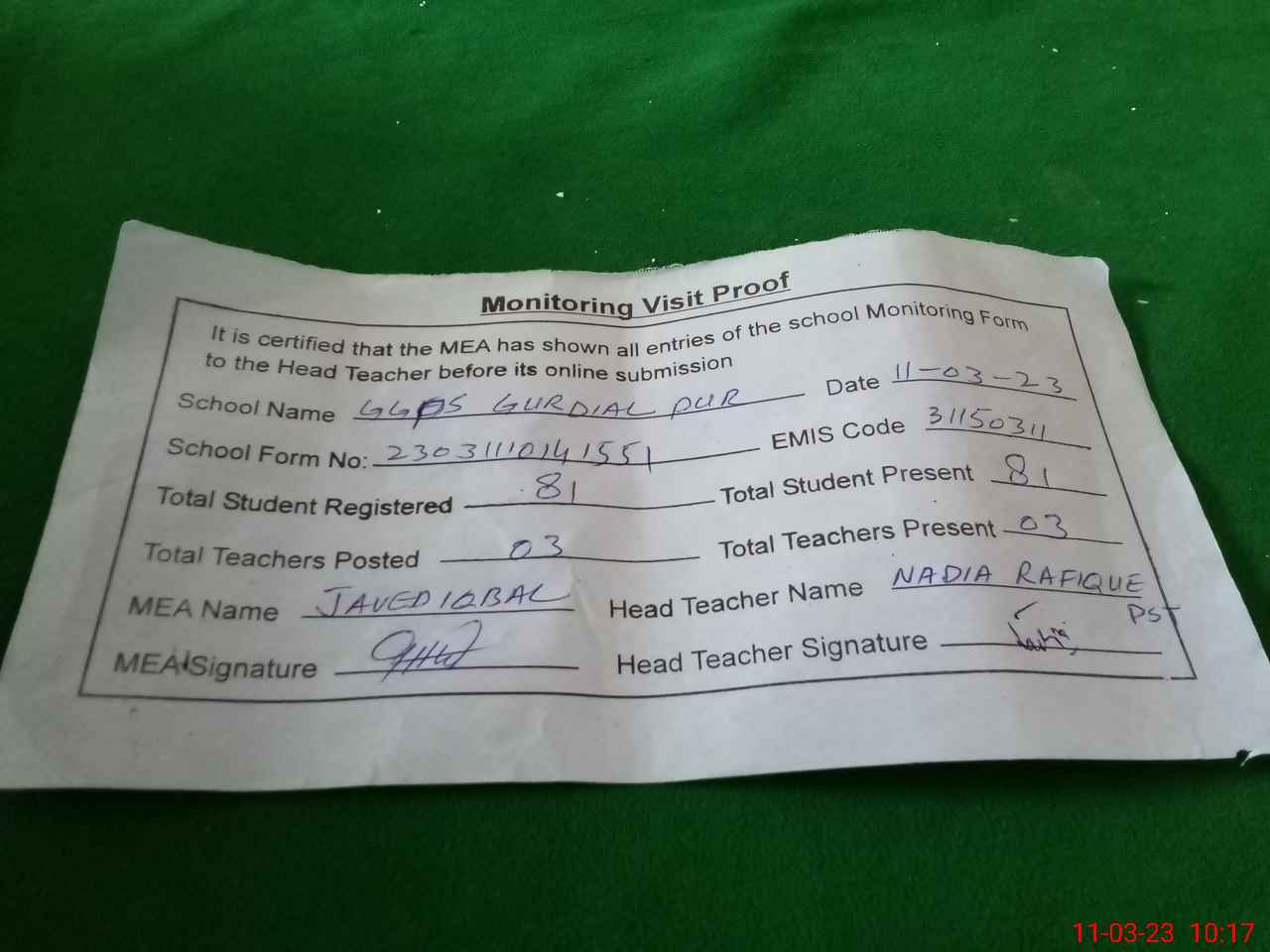 | Attendance Register | Head Teacher | MEA with School | Visit Proof |