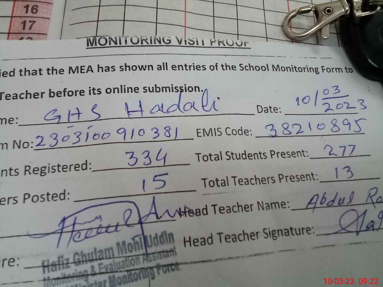 | EMIS Code: 38210895 | Name of School: GHS HADALI | |||