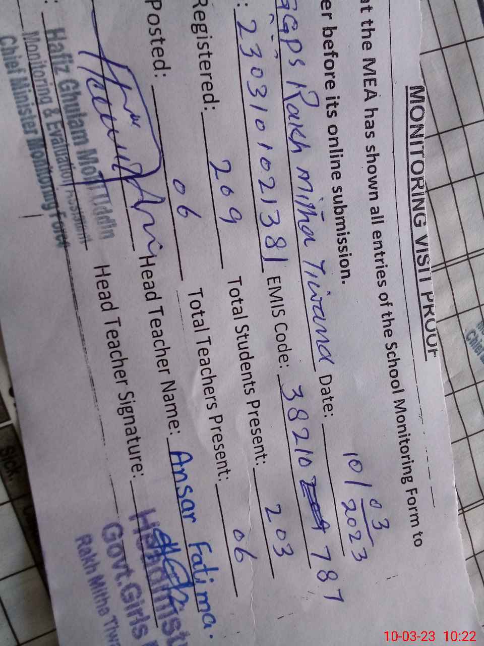 | Certified that this School was Inspected by the Undersigned MEA/DMO Today and the Information Stated Above is as Per Record. | |||||