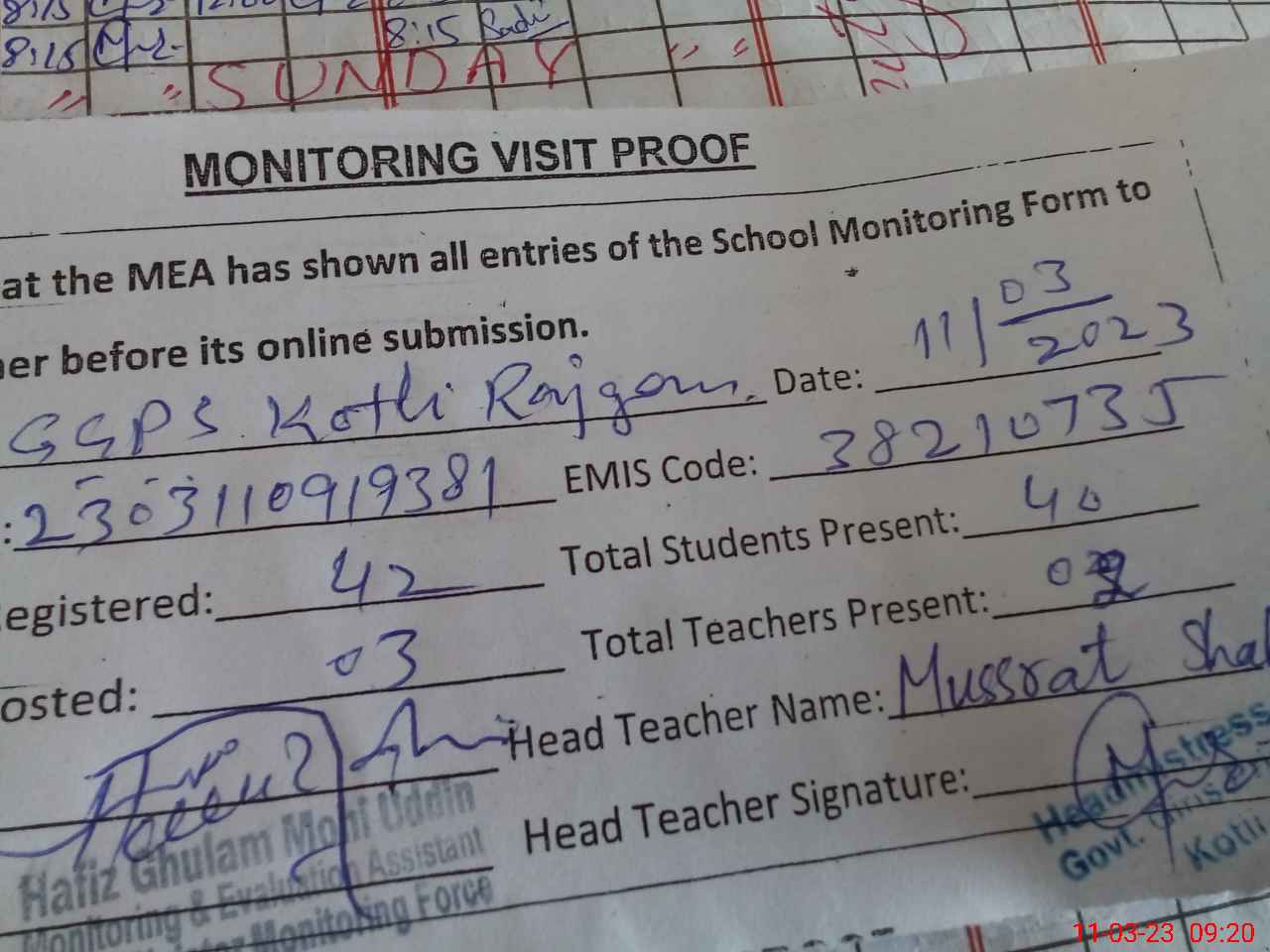 | Attendance Register | Head Teacher | MEA with School | Visit Proof |