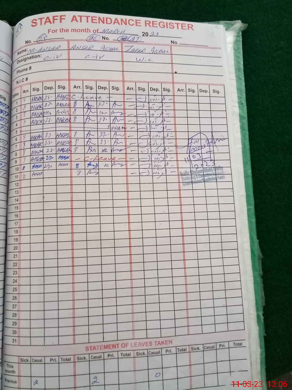 | CNIC | Full Name | Designation | R/C | Absence during last cal. month |