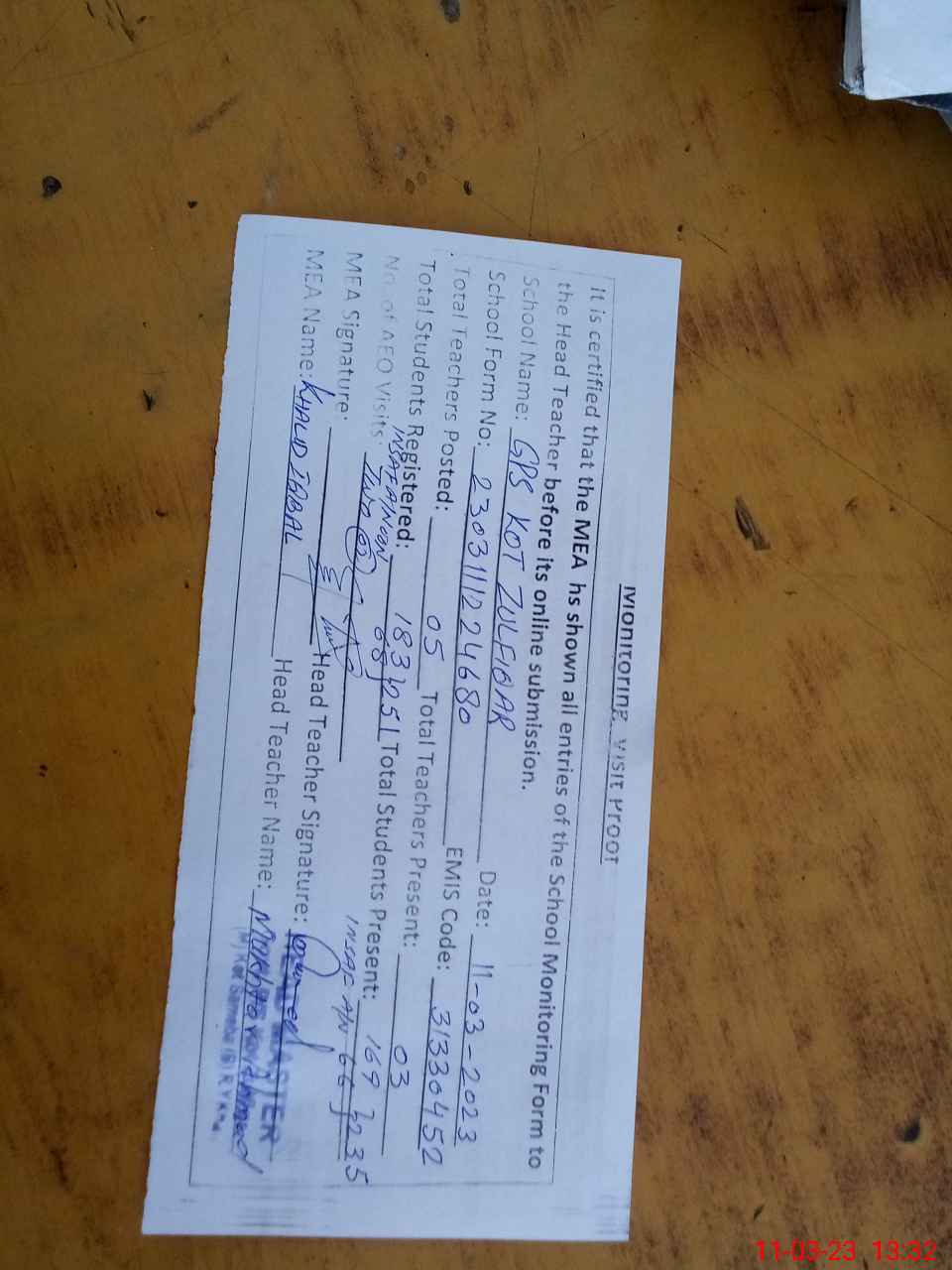 | Attendance Register | Head Teacher | MEA with School | Visit Proof |
