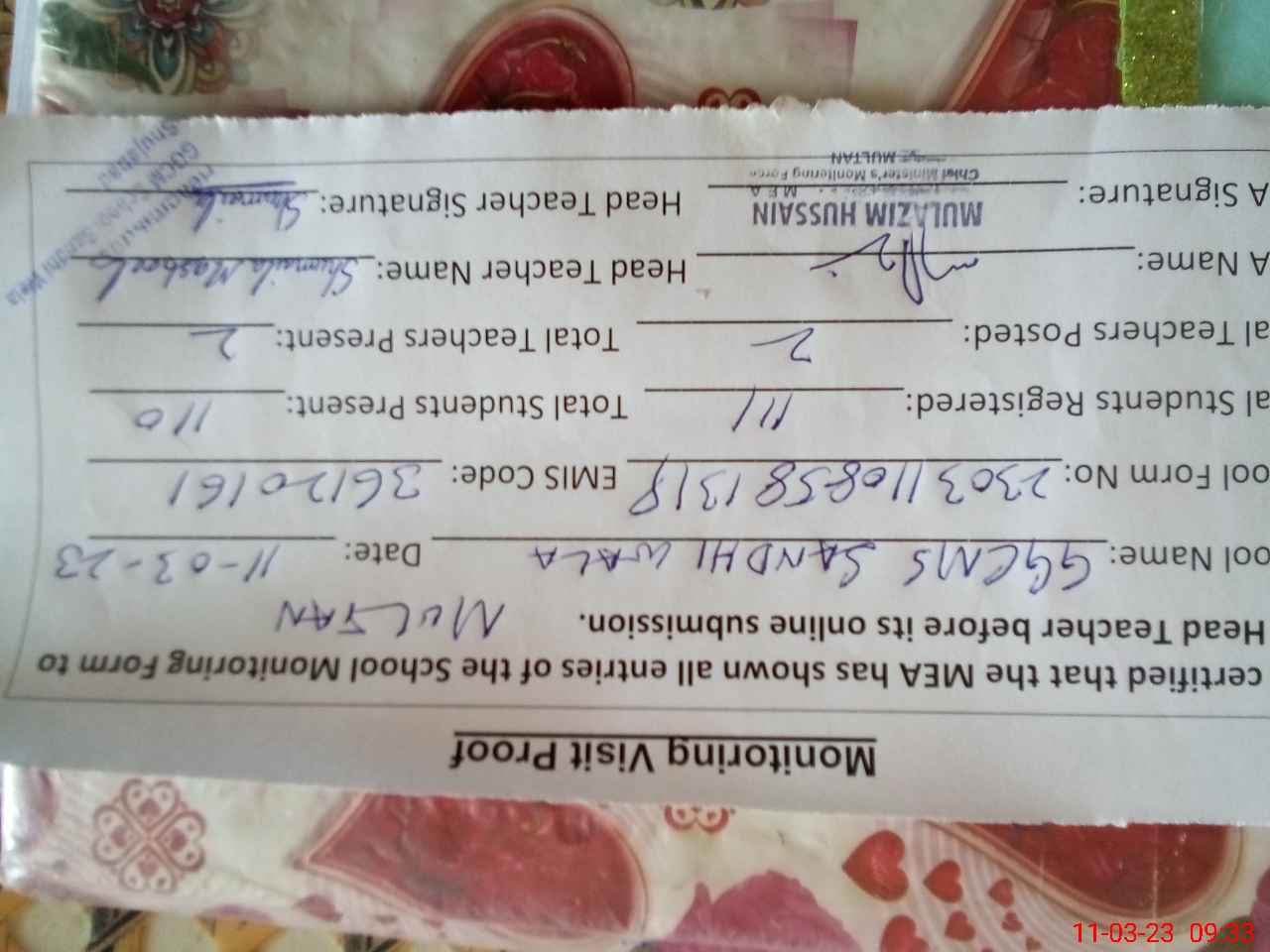| Certified that this School was Inspected by the Undersigned MEA/DMO Today and the Information Stated Above is as Per Record. | |||||