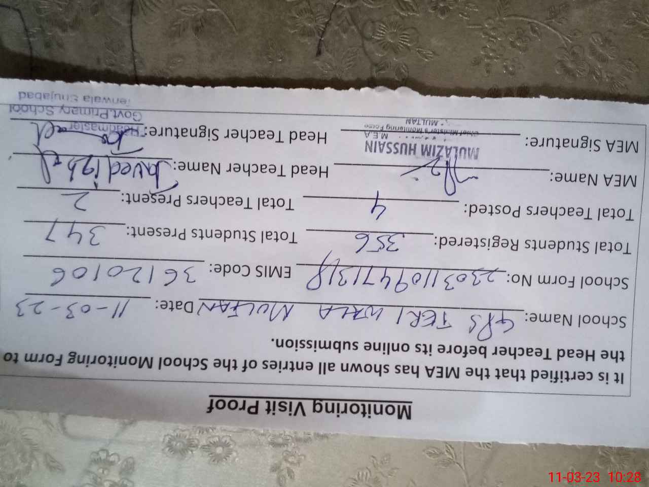 | Certified that this School was Inspected by the Undersigned MEA/DMO Today and the Information Stated Above is as Per Record. | |||||