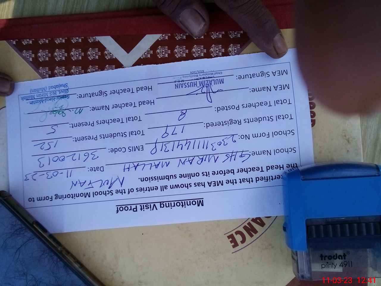| Certified that this School was Inspected by the Undersigned MEA/DMO Today and the Information Stated Above is as Per Record. | |||||