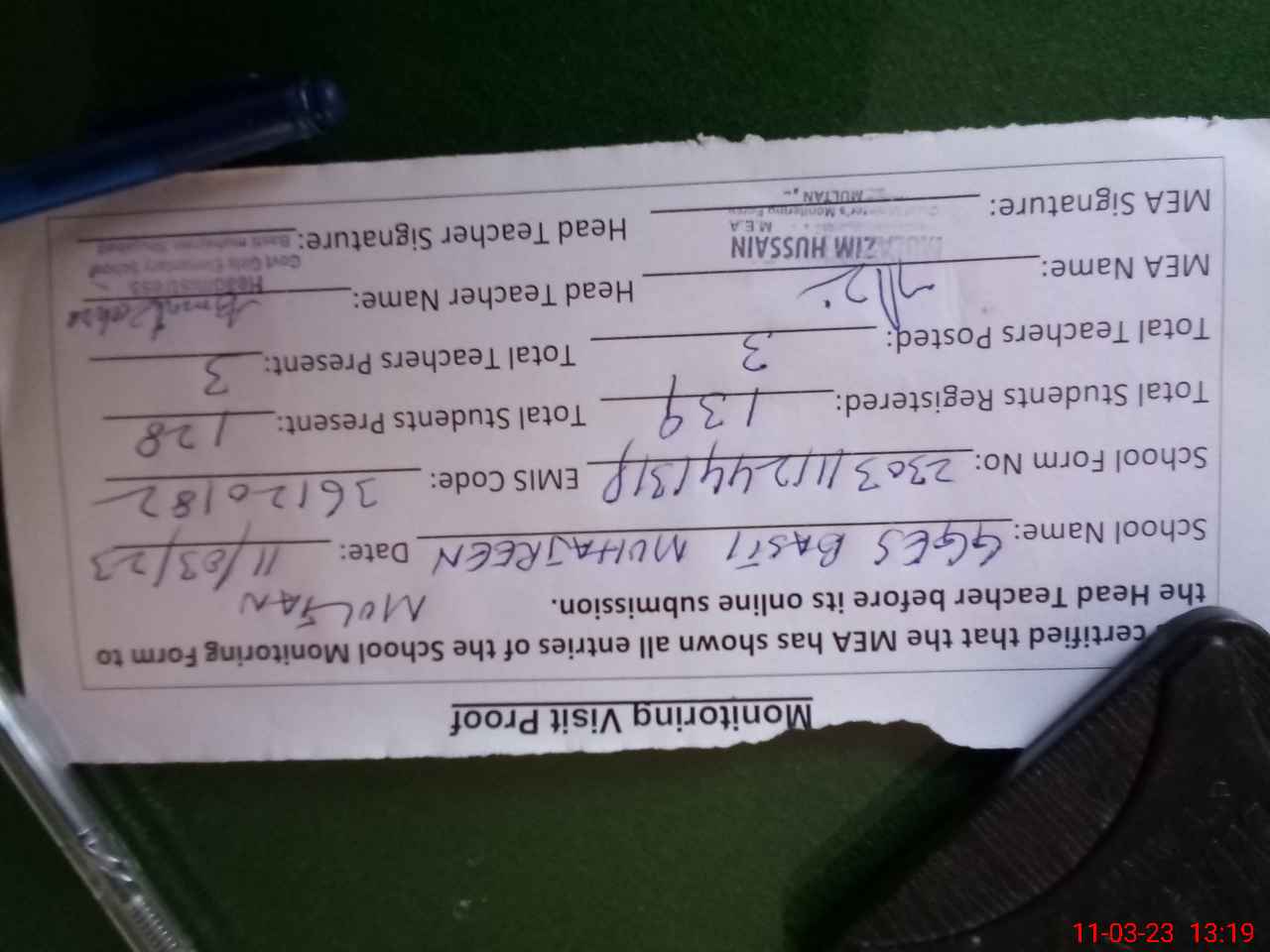 | Name: Az**** Za**** Designation: (School Headmaster's/Headmistress's) SST Phone/Cell Number: 03**** |