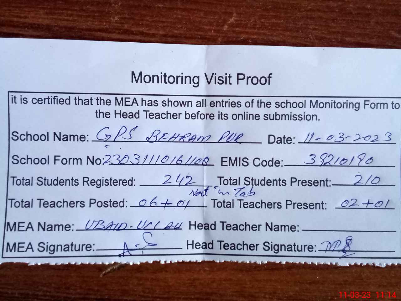 | Attendance Register | Head Teacher | MEA with School | Visit Proof |