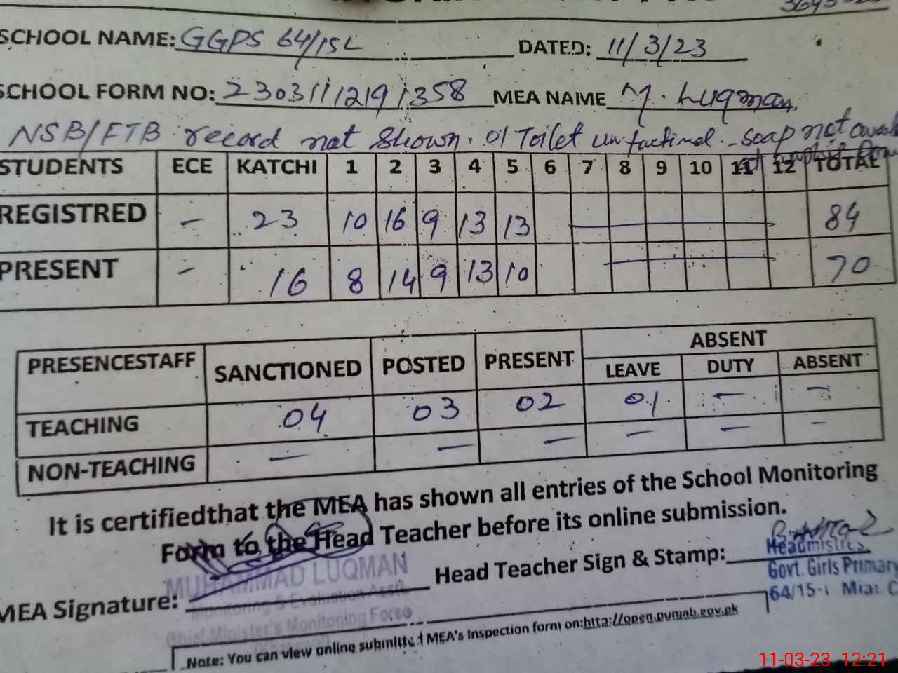 | Remarks (Use Separate Page if Required): 1 toilet found blocked NSB and FTF records registers not maintained accordingly | |||||