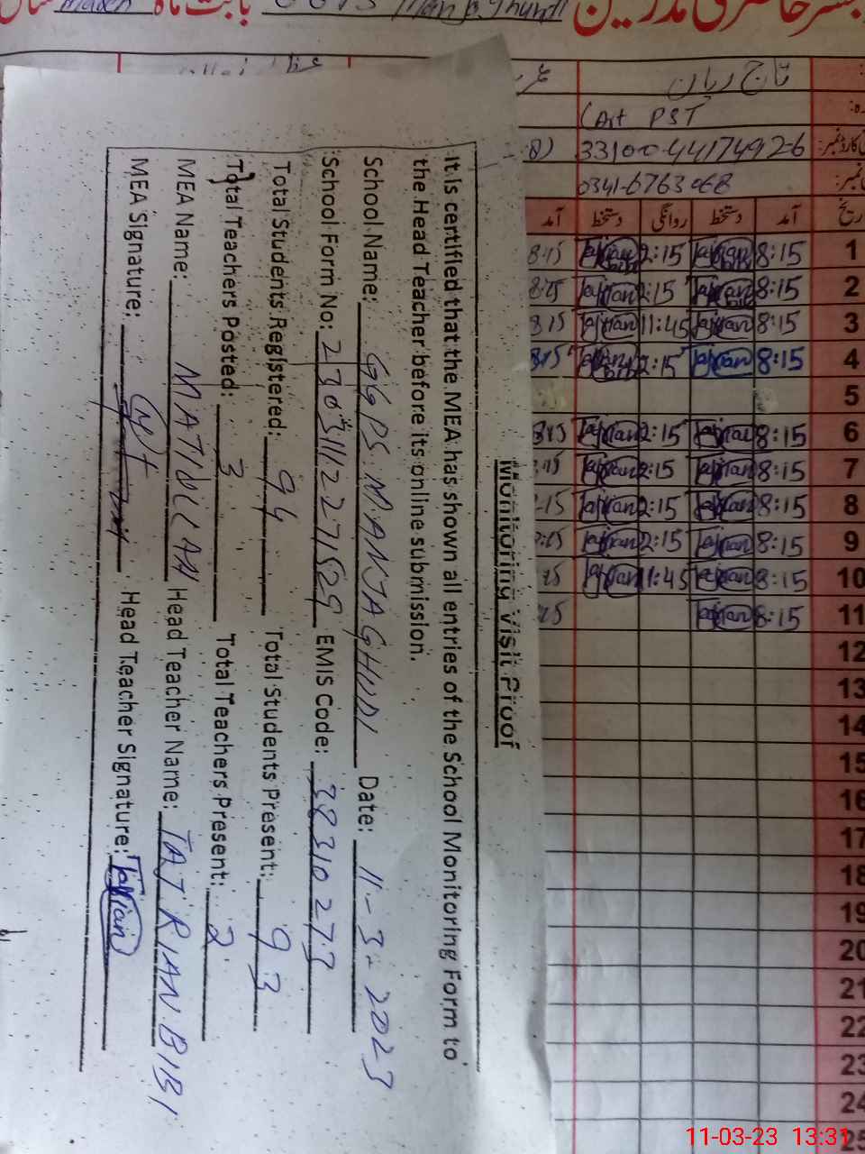 | Attendance Register | Head Teacher | MEA with School | Visit Proof |