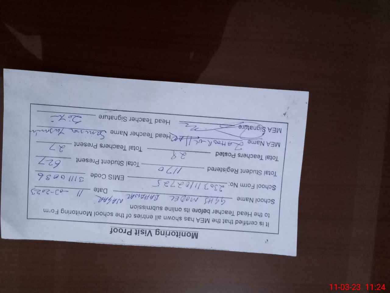 | Attendance Register | Head Teacher | MEA with School | Visit Proof |