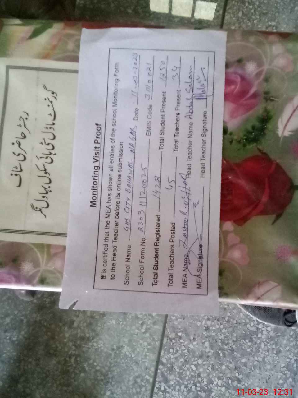 | Attendance Register | Head Teacher | MEA with School | Visit Proof |
