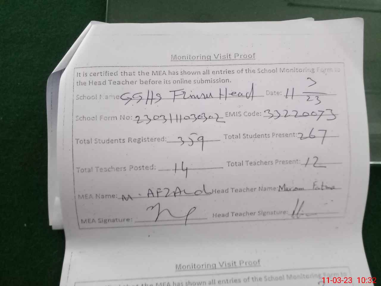 | Attendance Register | Head Teacher | MEA with School | Visit Proof |