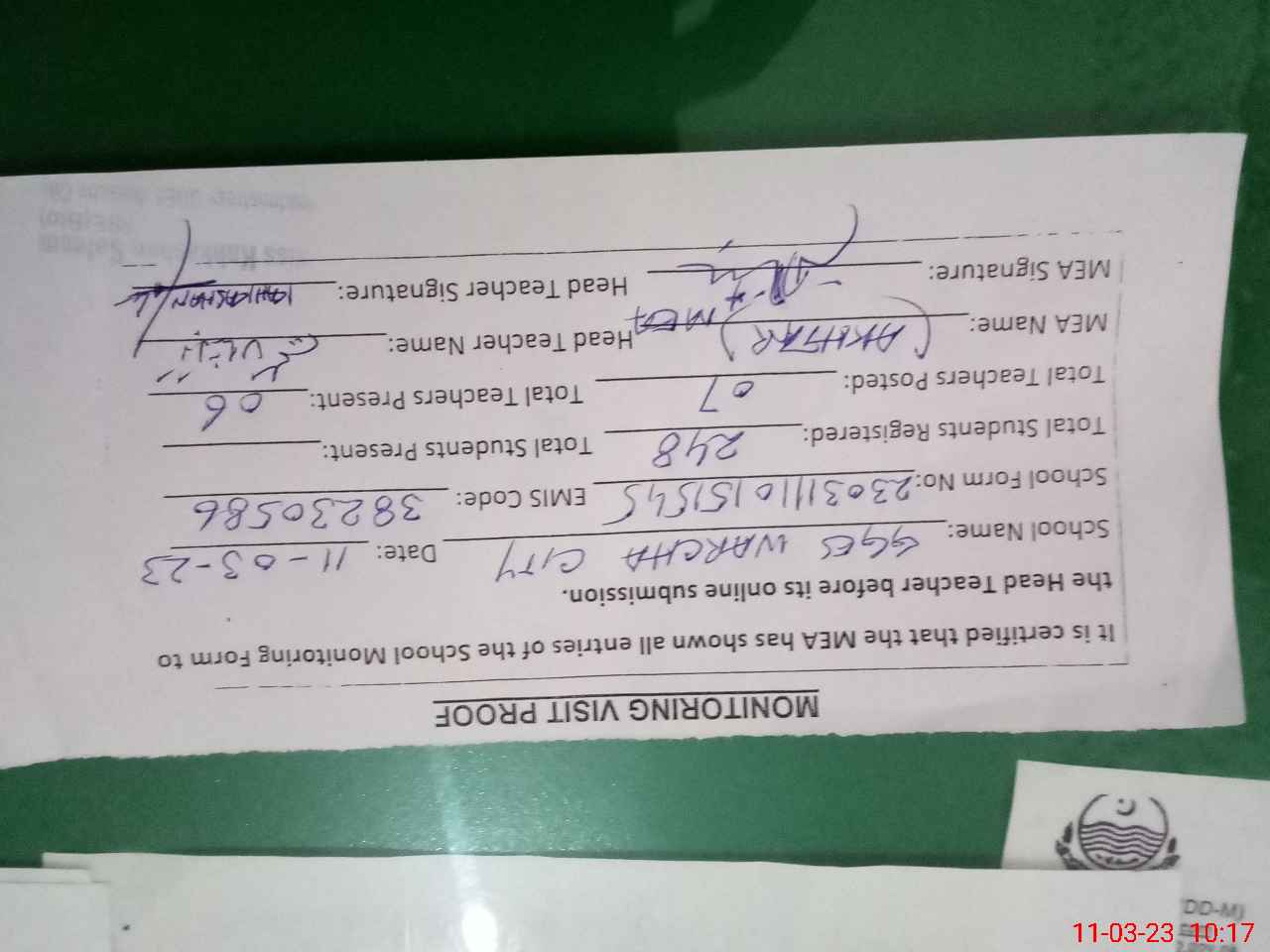 | Certified that this School was Inspected by the Undersigned MEA/DMO Today and the Information Stated Above is as Per Record. | |||||