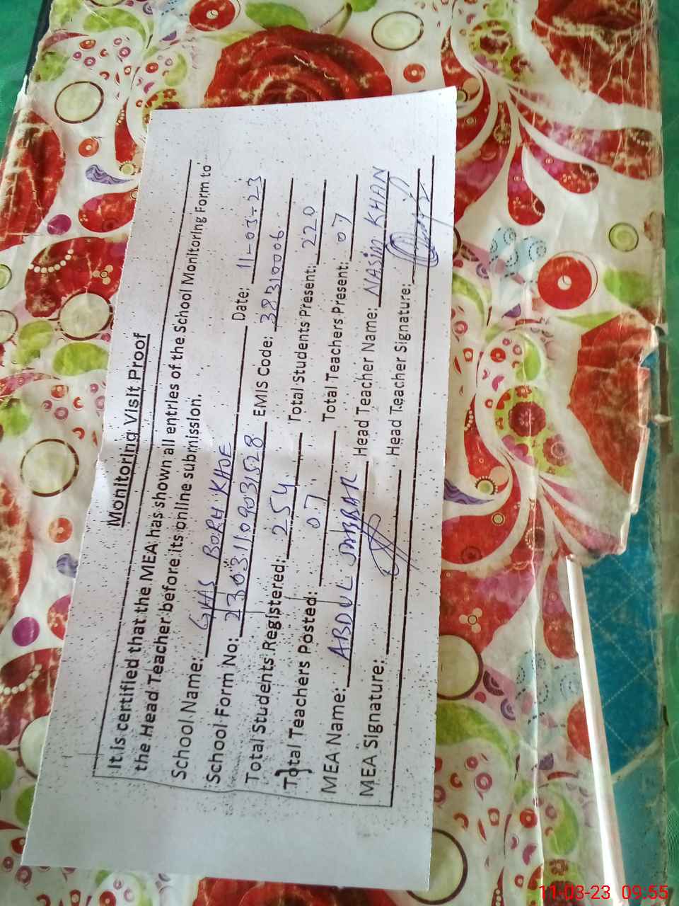 | Attendance Register | Head Teacher | MEA with School | Visit Proof |