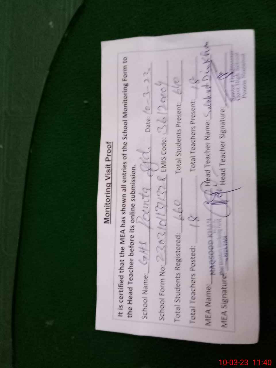 | Certified that this School was Inspected by the Undersigned MEA/DMO Today and the Information Stated Above is as Per Record. | |||||