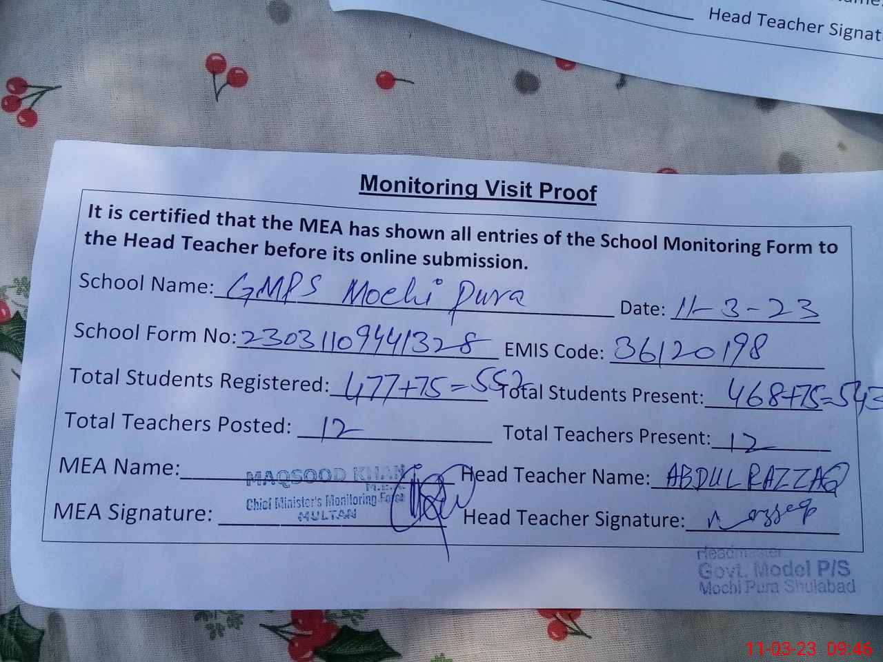 | EMIS Code: 36120198 | Name of School: GMPS MOCHI PURA SHUJABAD DISTT. MULTAN | |||