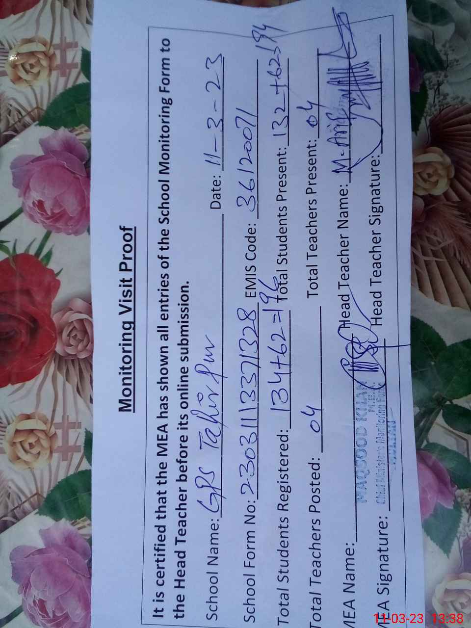 | Attendance Register | Head Teacher | MEA with School | Visit Proof |