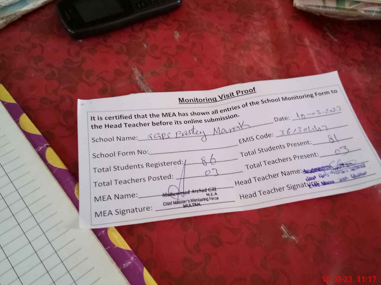 | Attendance Register | Head Teacher | MEA with School | Visit Proof |