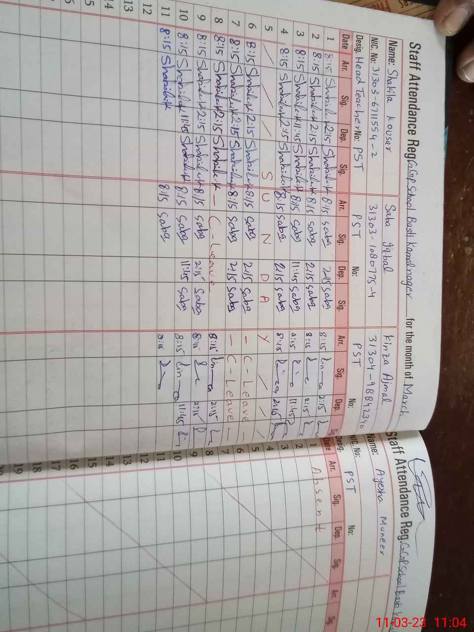 | CNIC | Full Name | Designation | R/C | Absence During Last Calender Month |