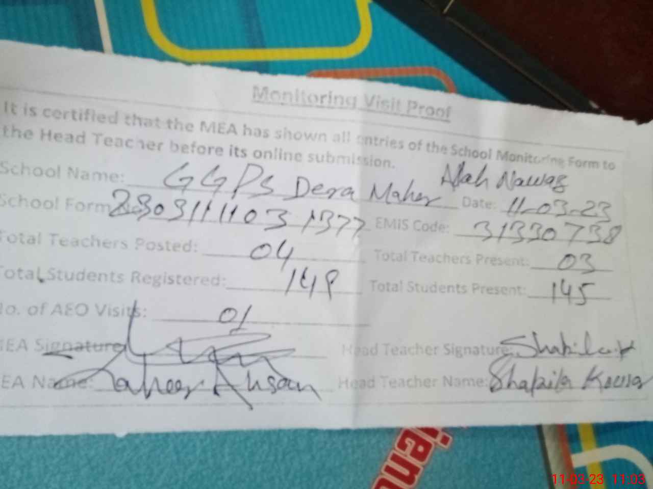 | Attendance Register | Head Teacher | MEA with School | Visit Proof |