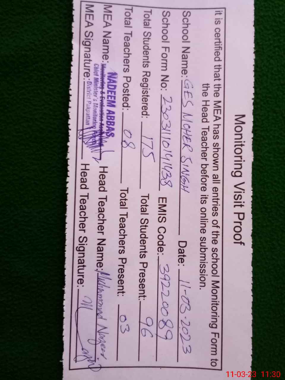 | EMIS Code: 39220089 | Name of School: GES MOHER SINGH ARIFWALA | |||