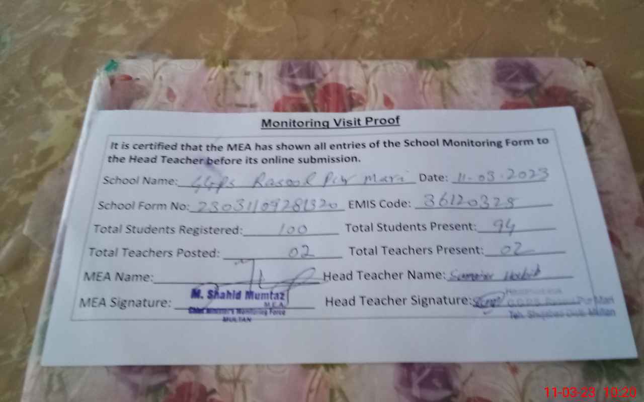 | EMIS Code: 36120325 | Name of School: GGPS RASOOL PUR MARI | |||