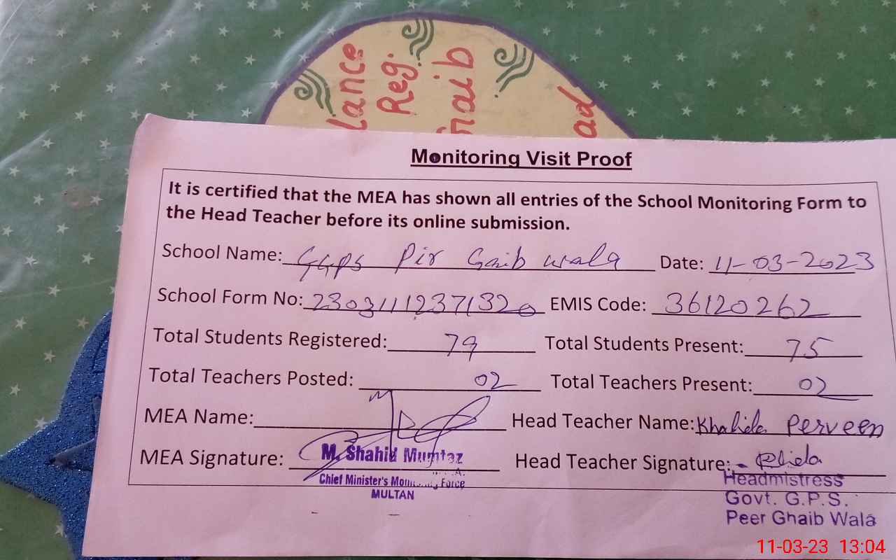 | EMIS Code: 36120262 | Name of School: GGPS PIR GAIB WALA SHUJABAD DISTT. MULTAN | |||