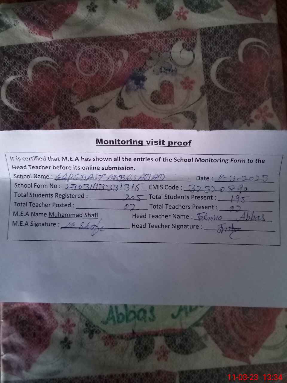 | Attendance Register | Head Teacher | MEA with School | Visit Proof |