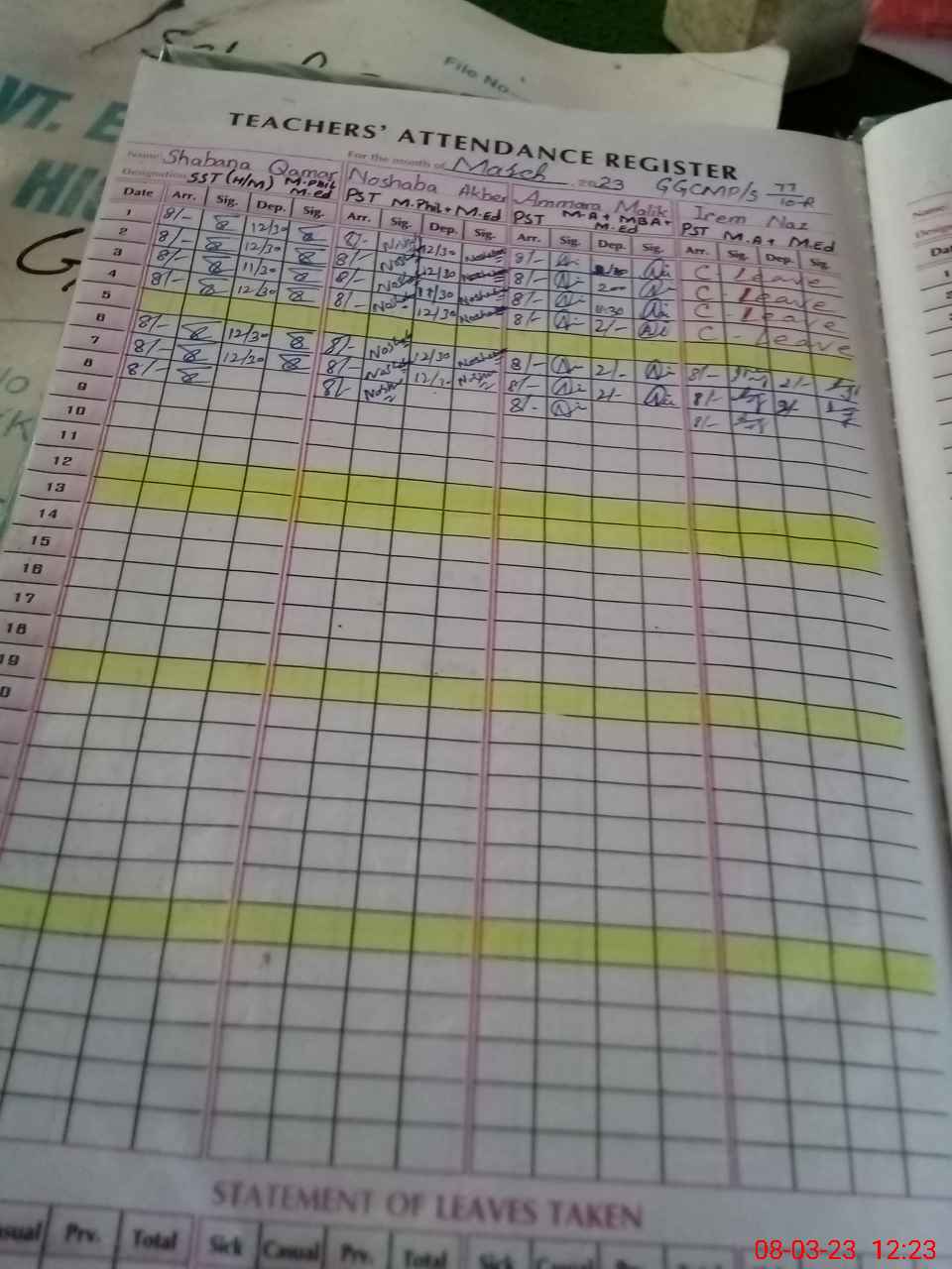 | CNIC | Full Name | Designation | R/C | Absence During Last Calender Month |