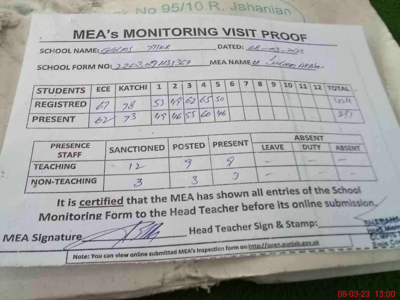| Attendance Register | Head Teacher | MEA with School | Visit Proof |