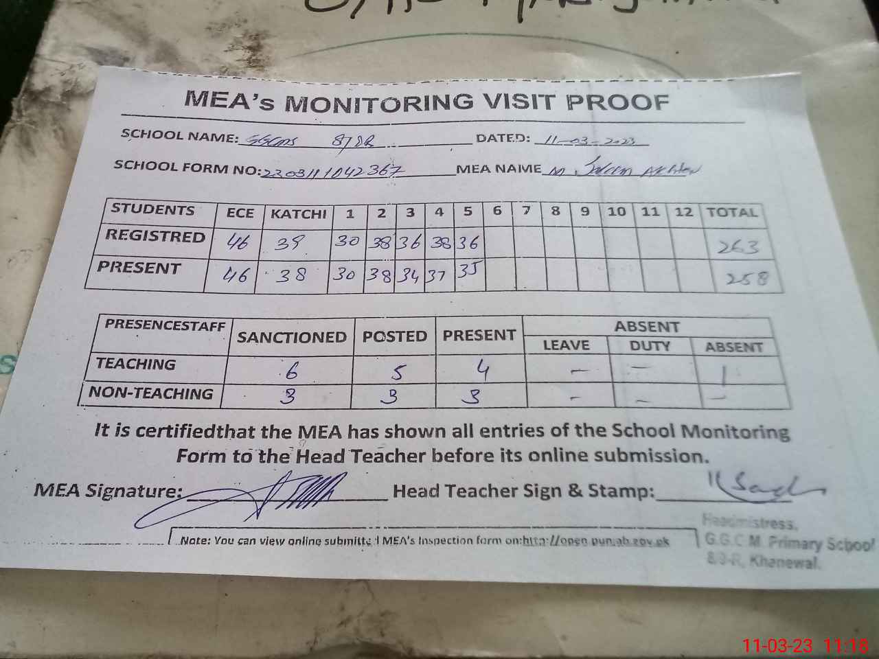 | Attendance Register | Head Teacher | MEA with School | Visit Proof |