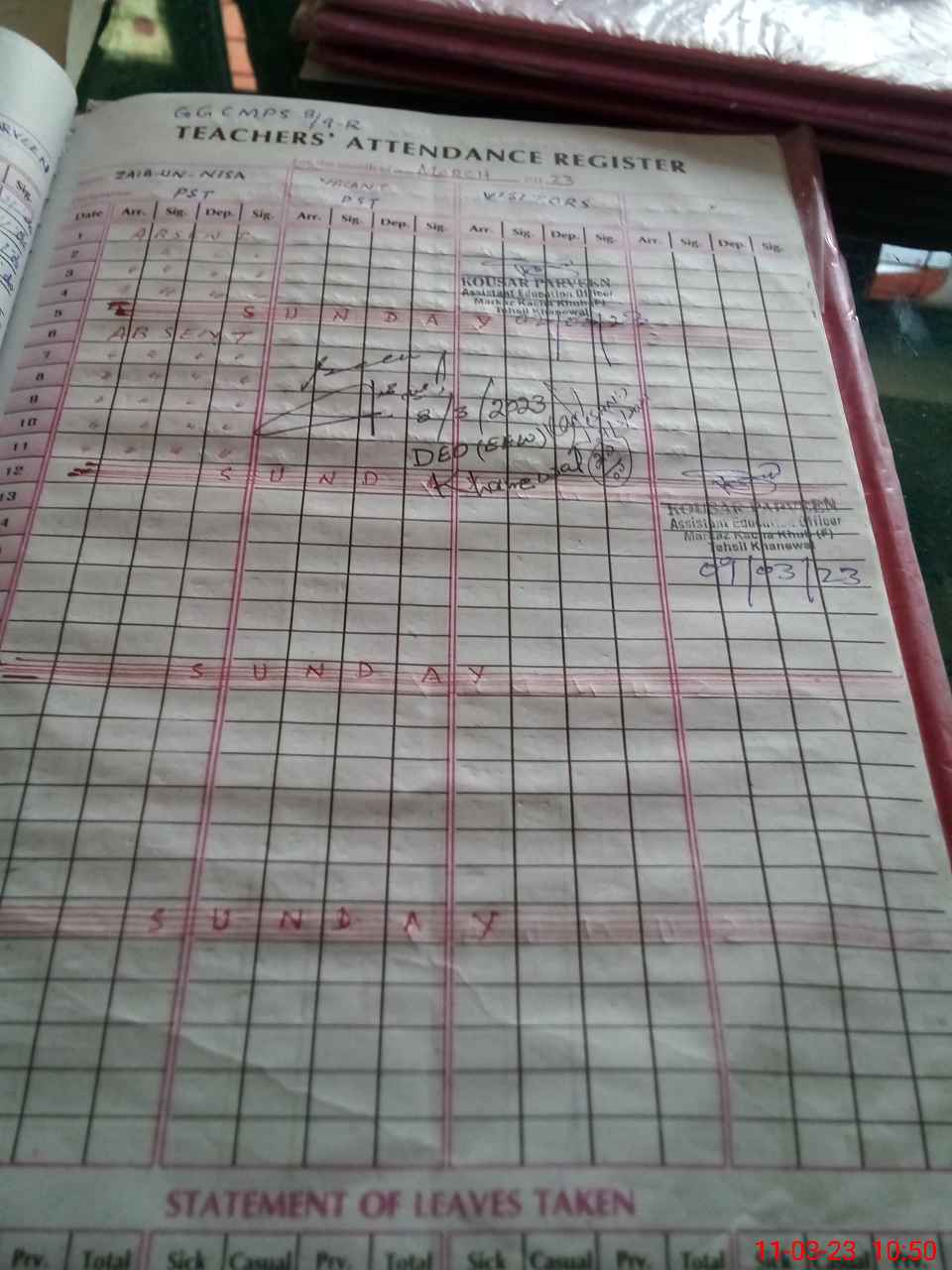 | Remarks (Use Separate Page if Required): Zain un nisa PST teacher Found absent from 21 January 2023 | |||||
