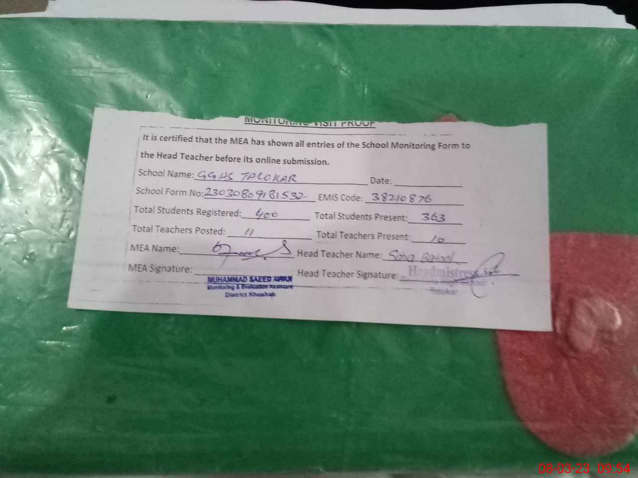 | EMIS Code: 38210876 | Name of School: GGHS TALOKAR | |||