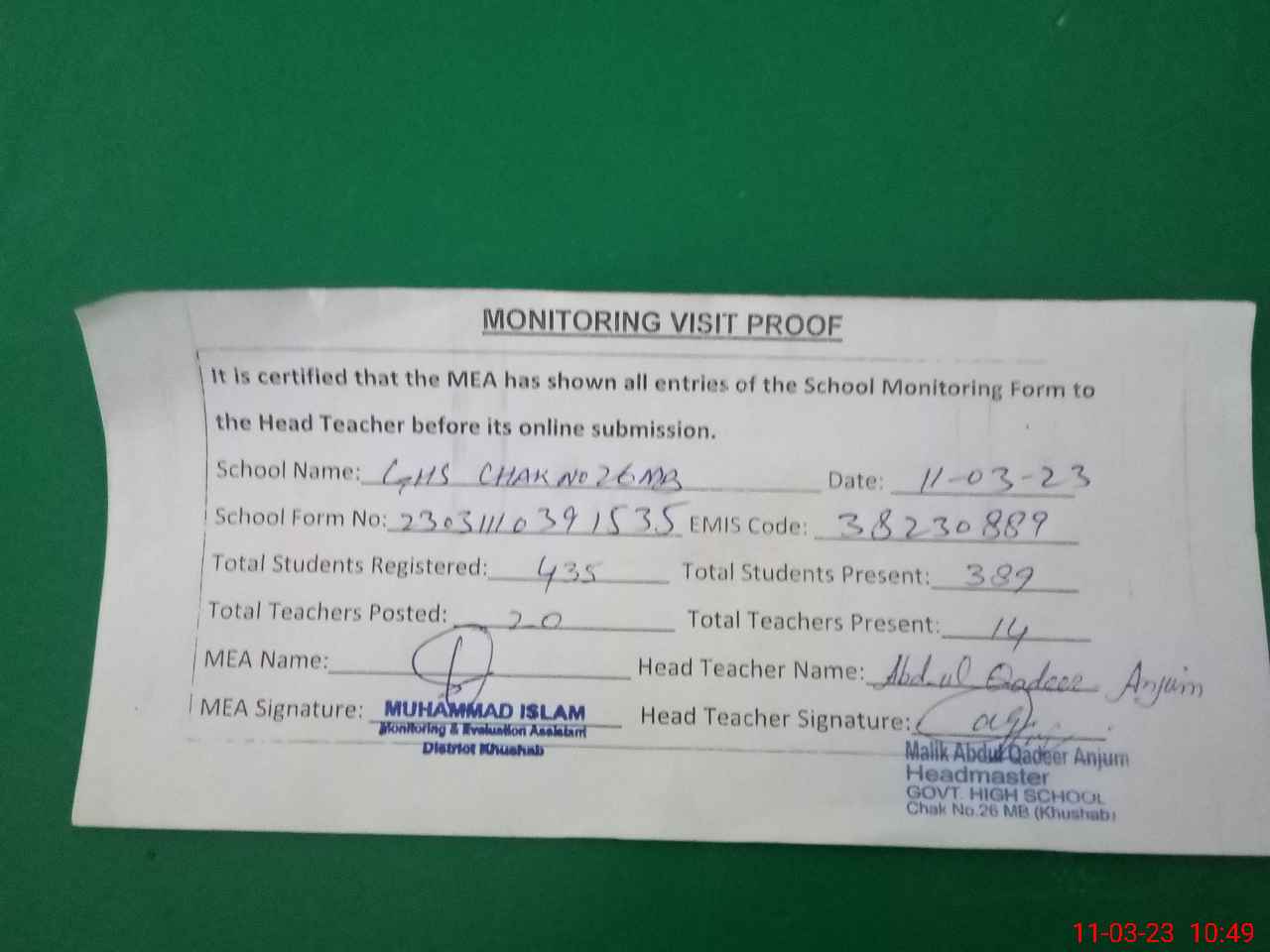 | Certified that this School was Inspected by the Undersigned MEA/DMO Today and the Information Stated Above is as Per Record. | |||||