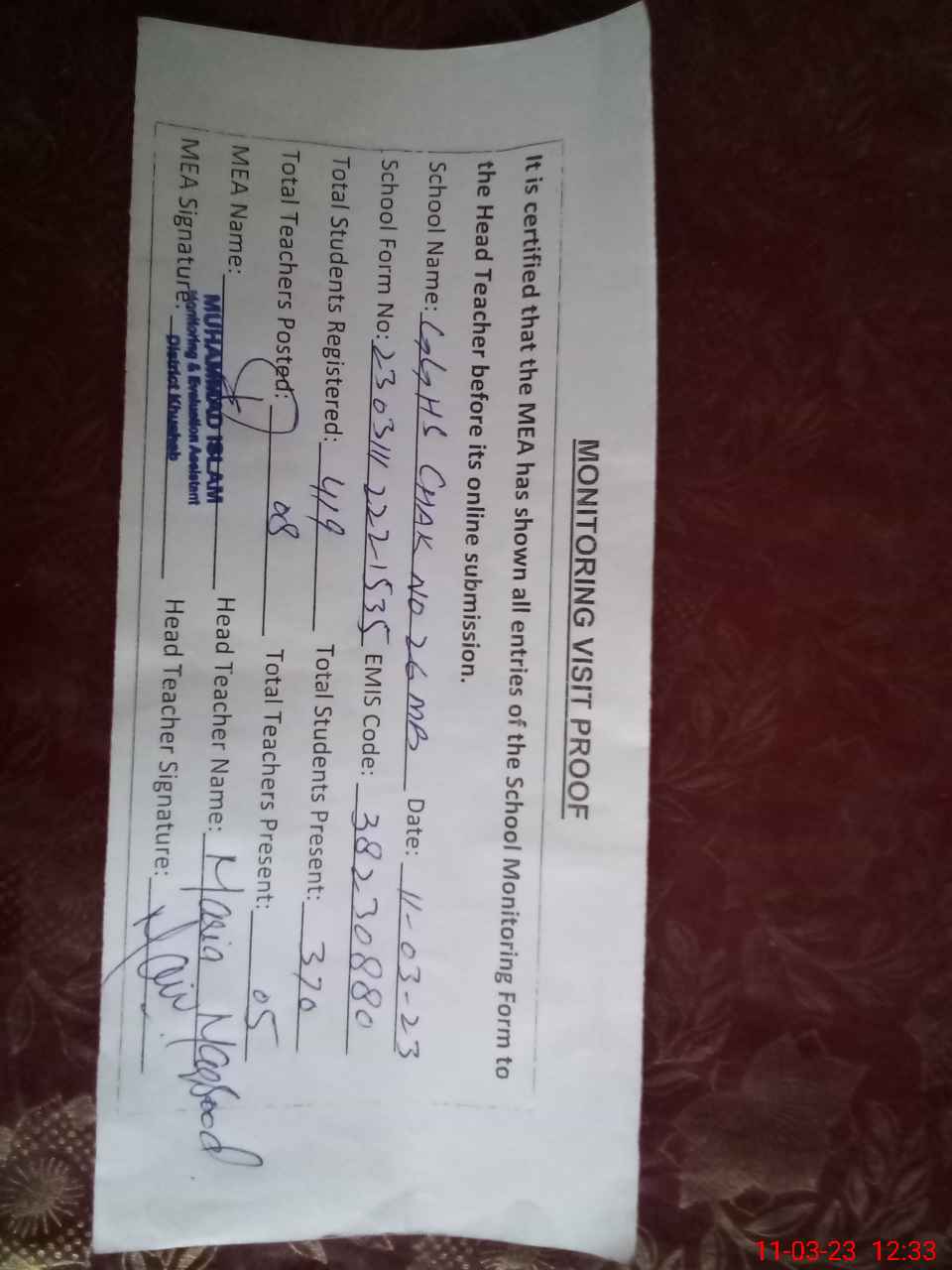 | Attendance Register | Head Teacher | MEA with School | Visit Proof |