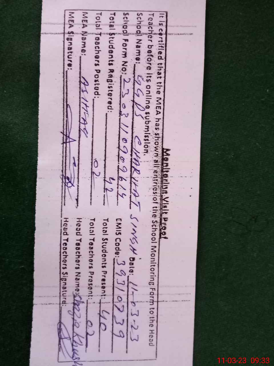 | Attendance Register | Head Teacher | MEA with School | Visit Proof |