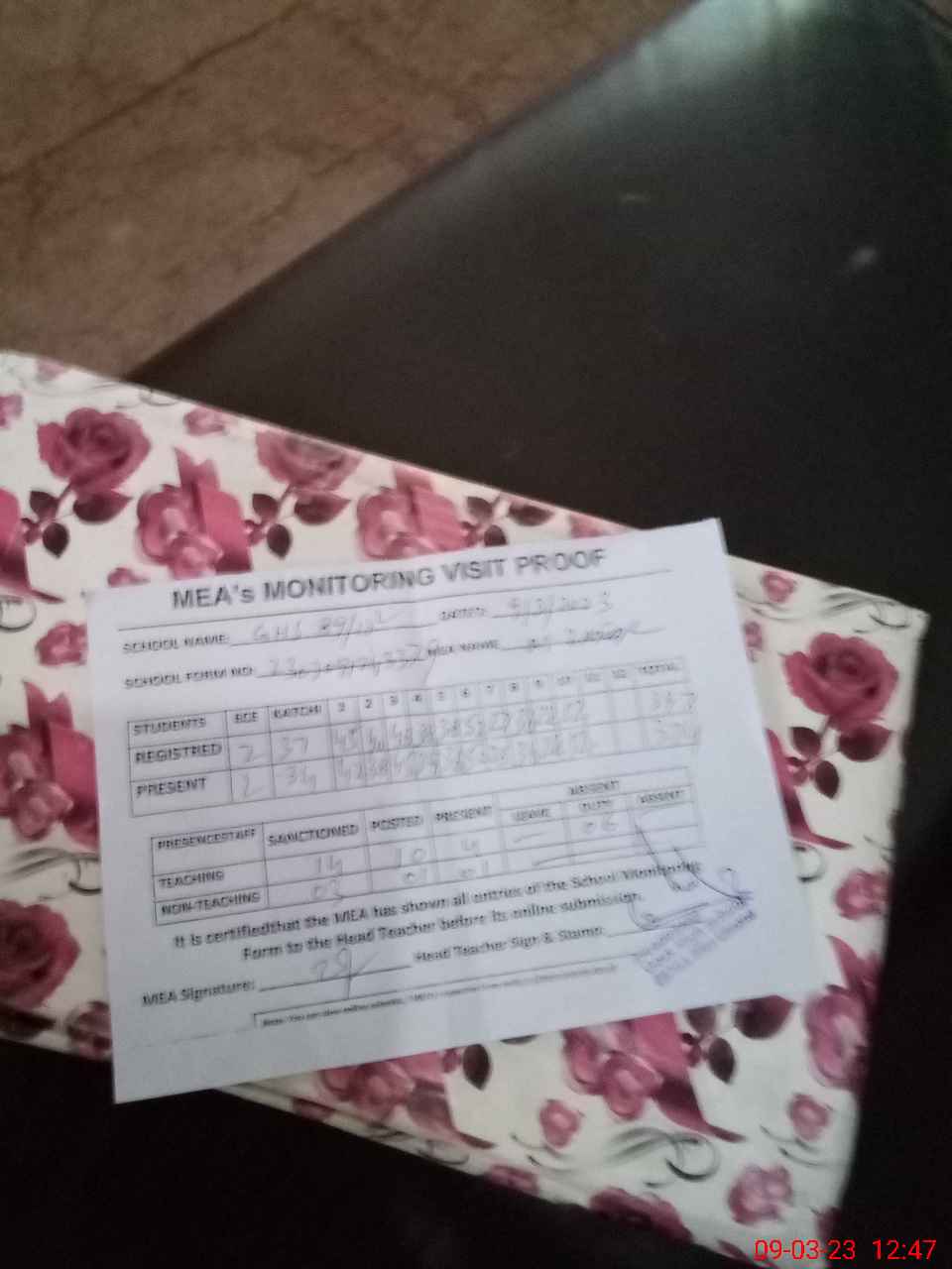| Attendance Register | Head Teacher | MEA with School | Visit Proof |