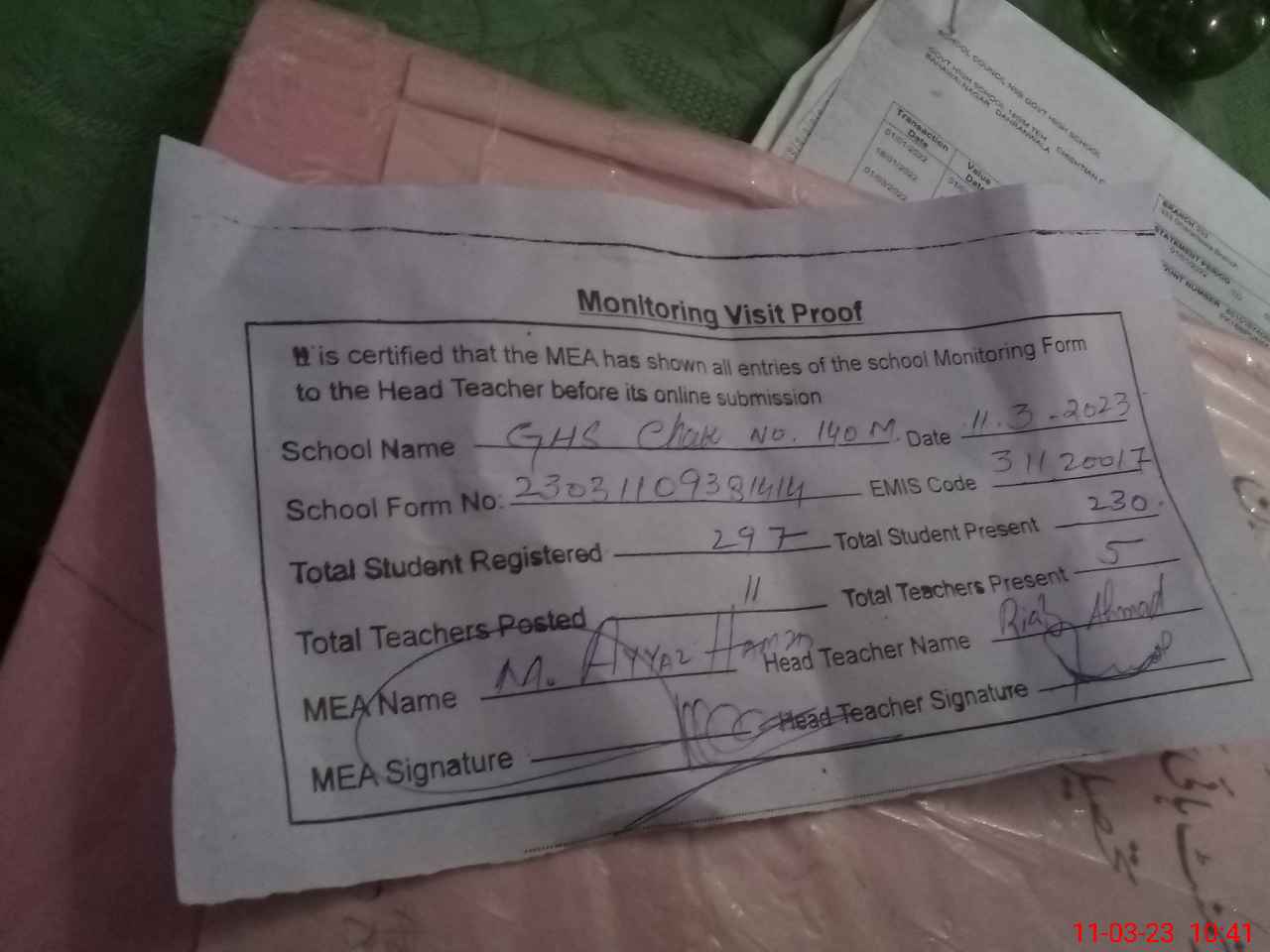 | Attendance Register | Head Teacher | MEA with School | Visit Proof |
