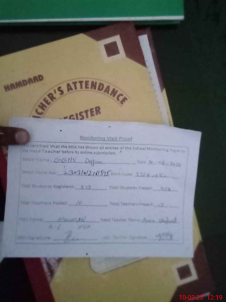 | Attendance Register | Head Teacher | MEA with School | Visit Proof |