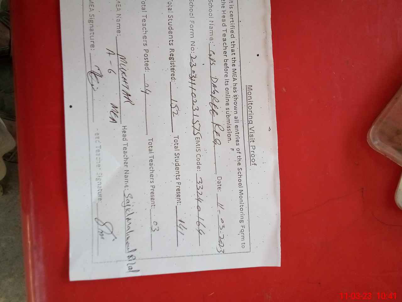 | Attendance Register | Head Teacher | MEA with School | Visit Proof |