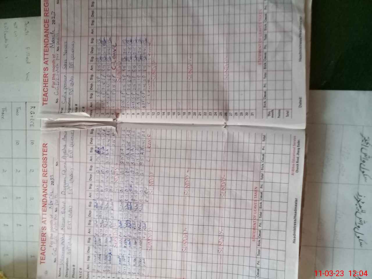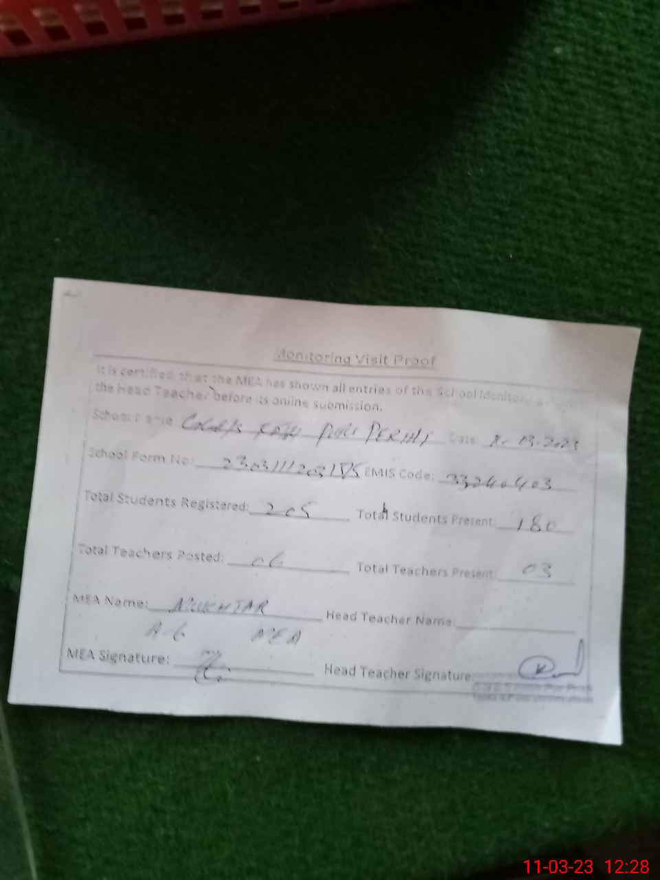 | Attendance Register | Head Teacher | MEA with School | Visit Proof |