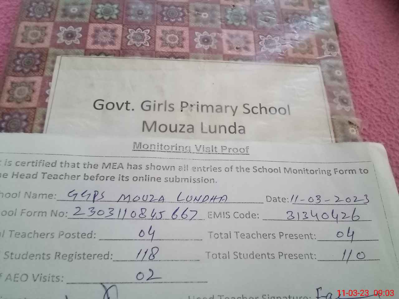 | Attendance Register | Head Teacher | MEA with School | Visit Proof |
